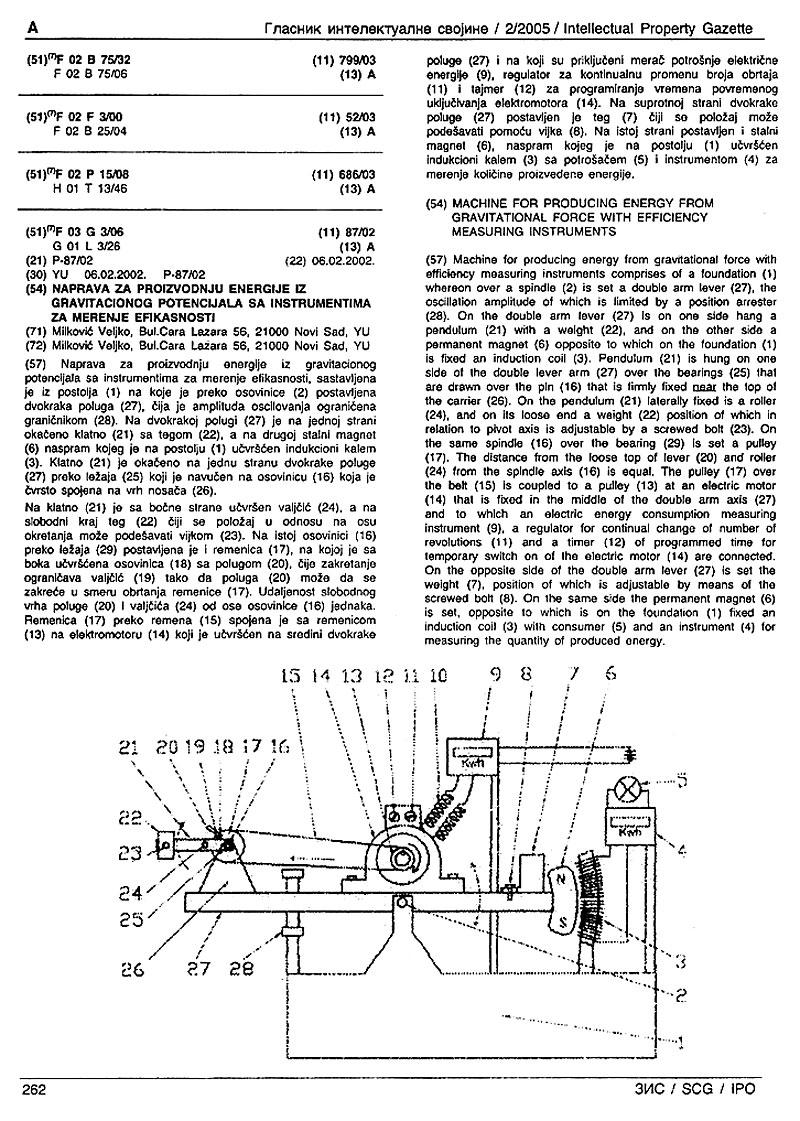 Patents of Veljko Milkovic -- Patent #11: A machine for the production of energy from gravity potential...