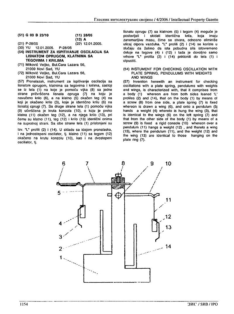 Patents of Veljko Milkovic -- Patent #23: Instruments for checking oscillation with plate spring, pendulums with weights and wings