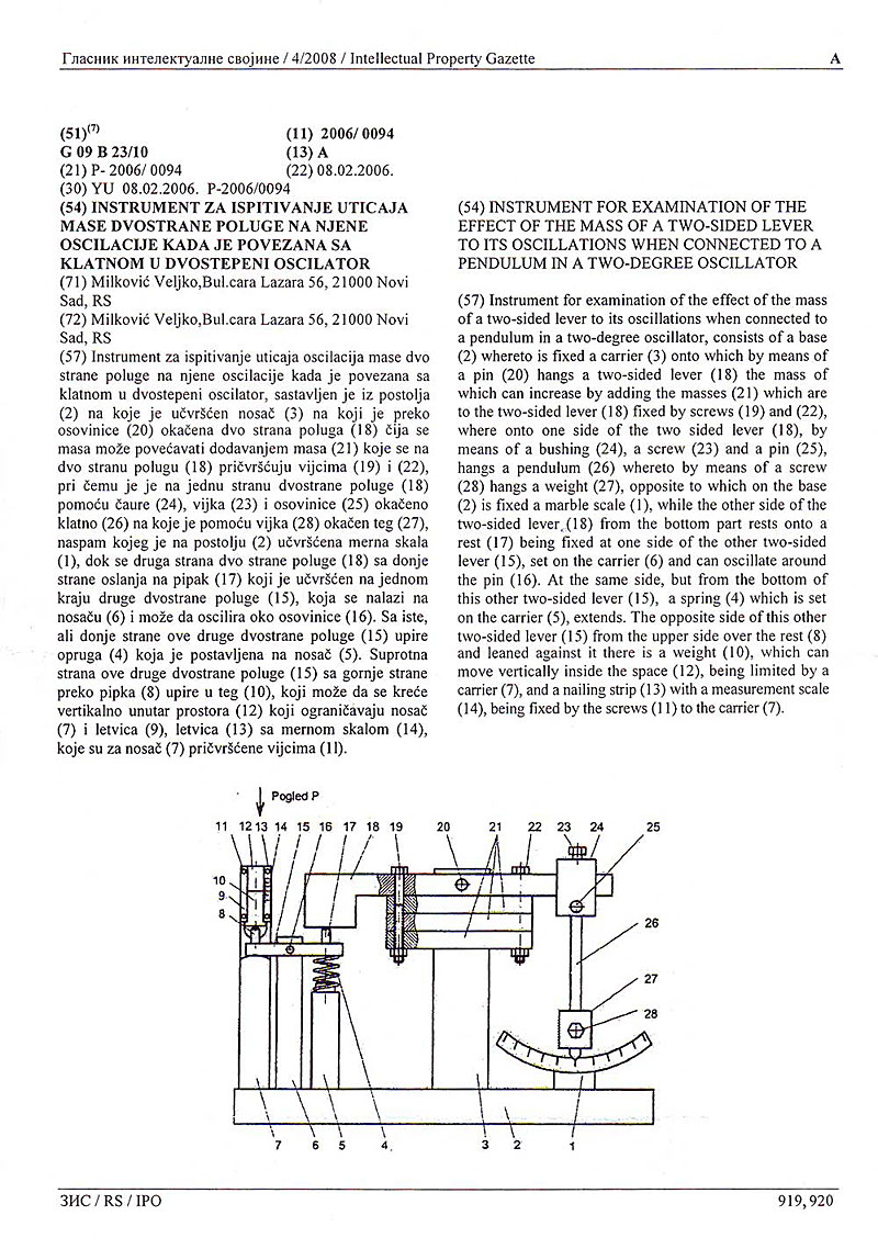 Patents of Veljko Milkovic -- Patent #15: Device for inspection of oscillations created by a two-armed leaver and a pendulum...