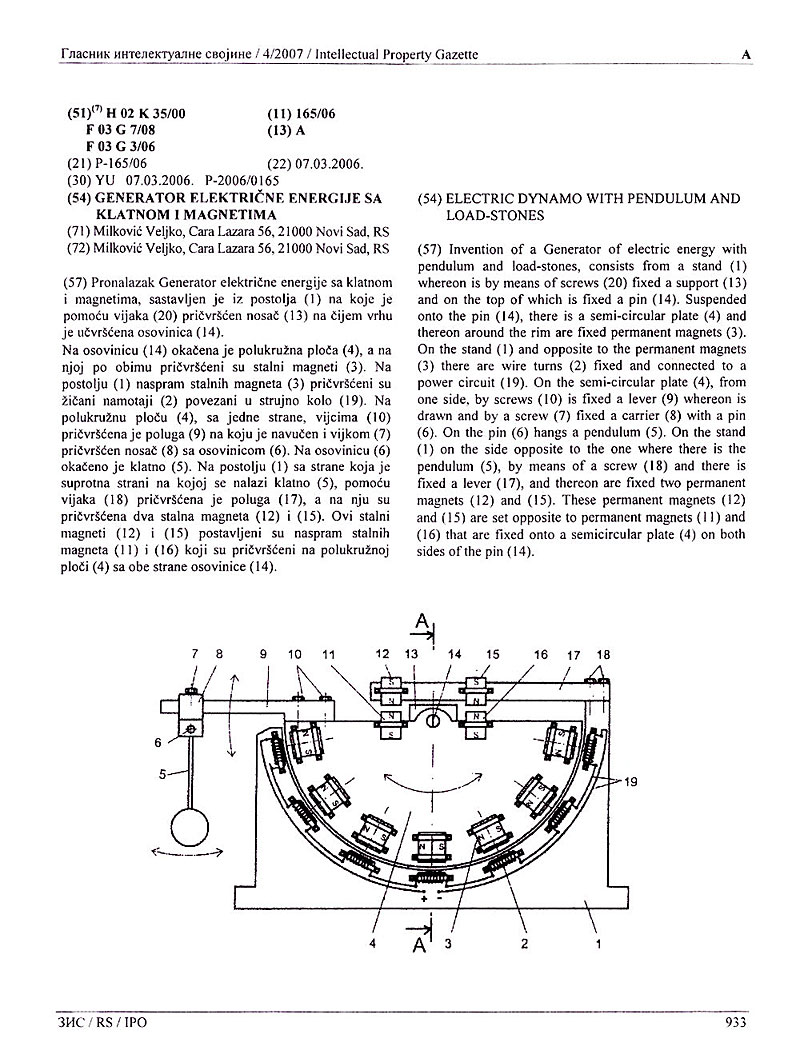 Patents of Veljko Milkovic -- Patent #27: Electric dynamo with pendulum and magnets