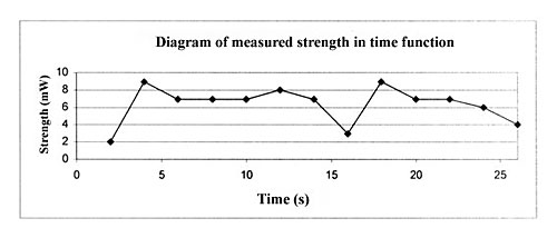 The following values were acquired: the values of the measured electrical current varied between 91 mW and 228 mW (first measurement) and the values of the measured electrical current varied between 2 mW and 9 mW (second measurement). more