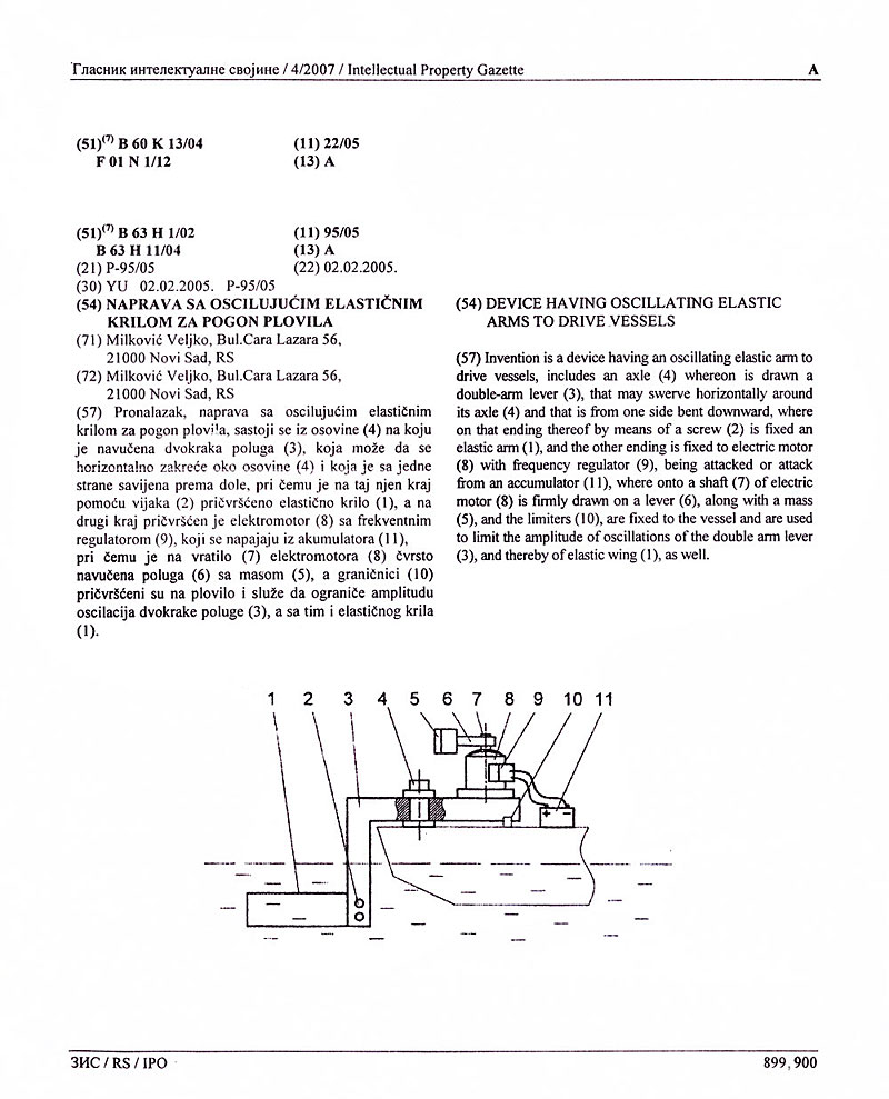 Patents of Veljko Milkovic -- Patent #24: Device having oscillating elastic arms to drive vessels