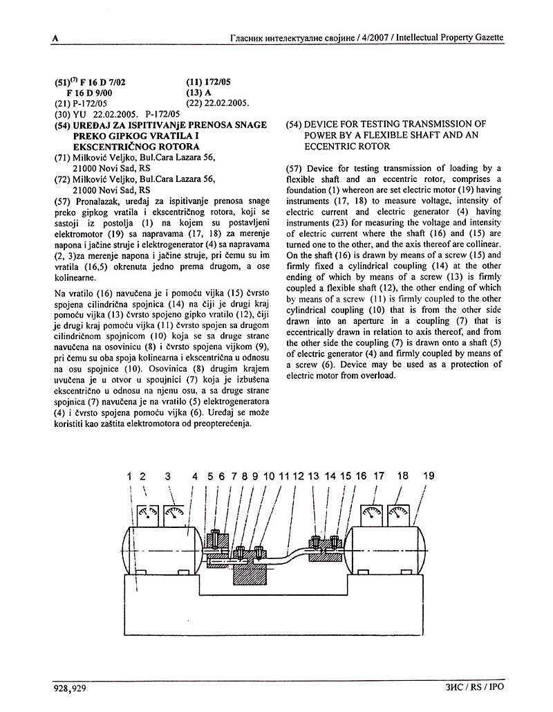 Patents of Veljko Milkovic -- Patent #25: Device for testing transmission of power by a flexible shaft and an eccentric rotor